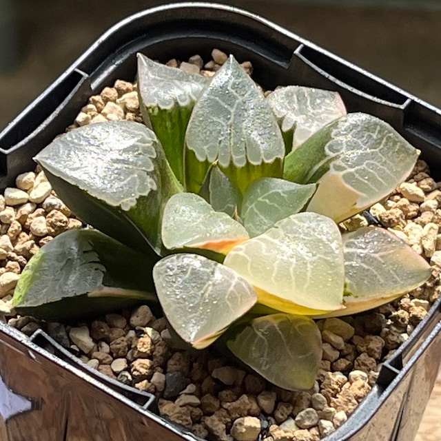 大粒・大窓の大型オブツーサ交配種錦 青光りの窓が美しいハオルチアです。