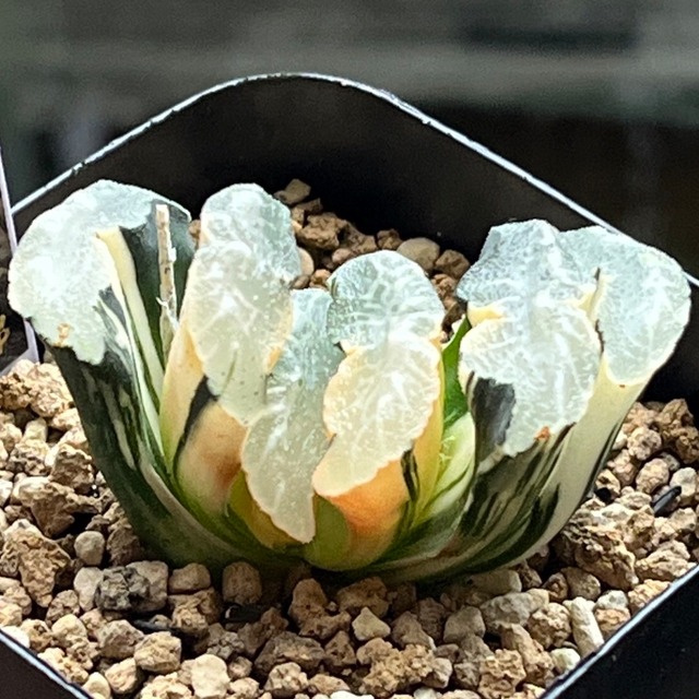 成長すると窓に荒々しい白が入り、荒磯って名前がピッタリなハオルチアになります。 斑入りは珍しいと思います。