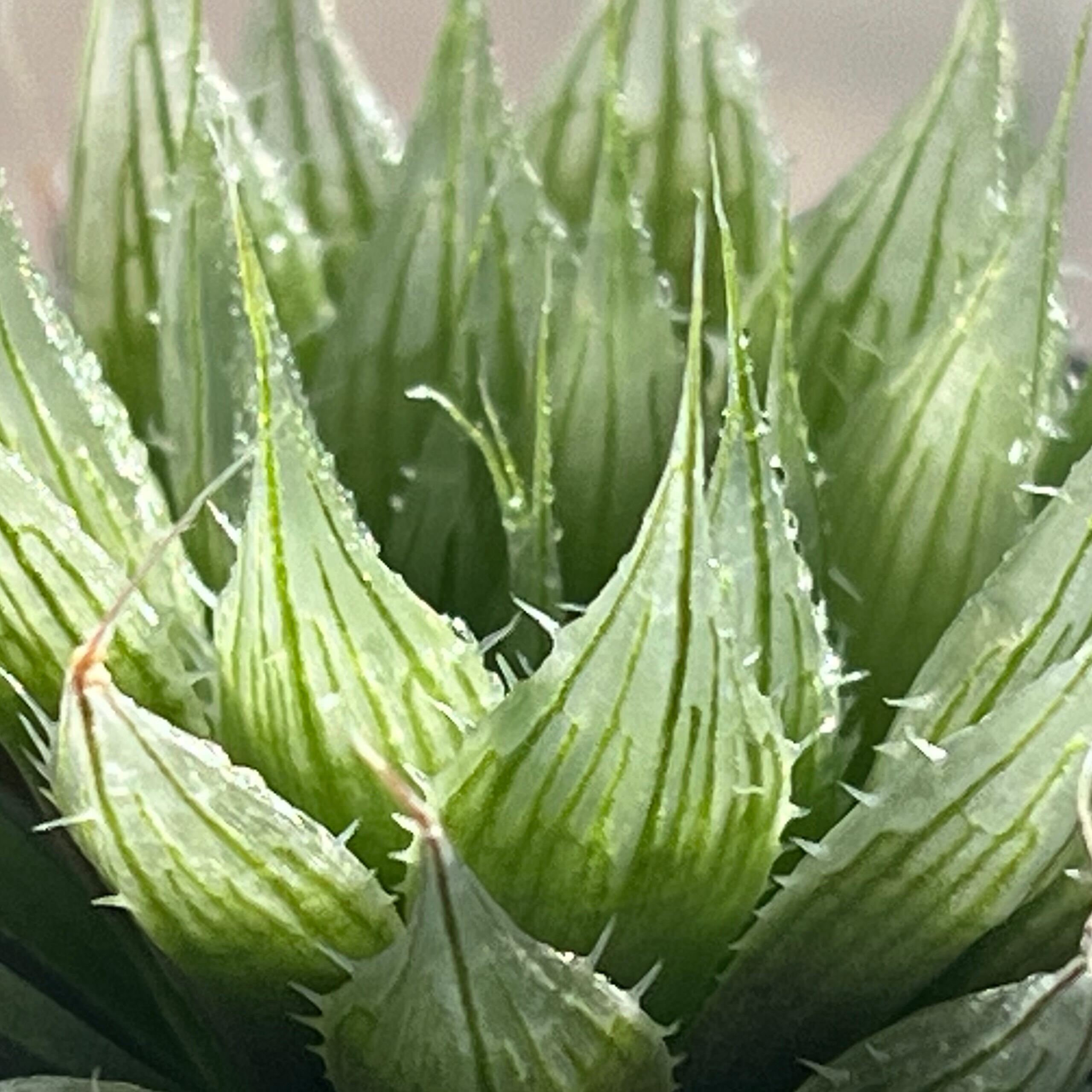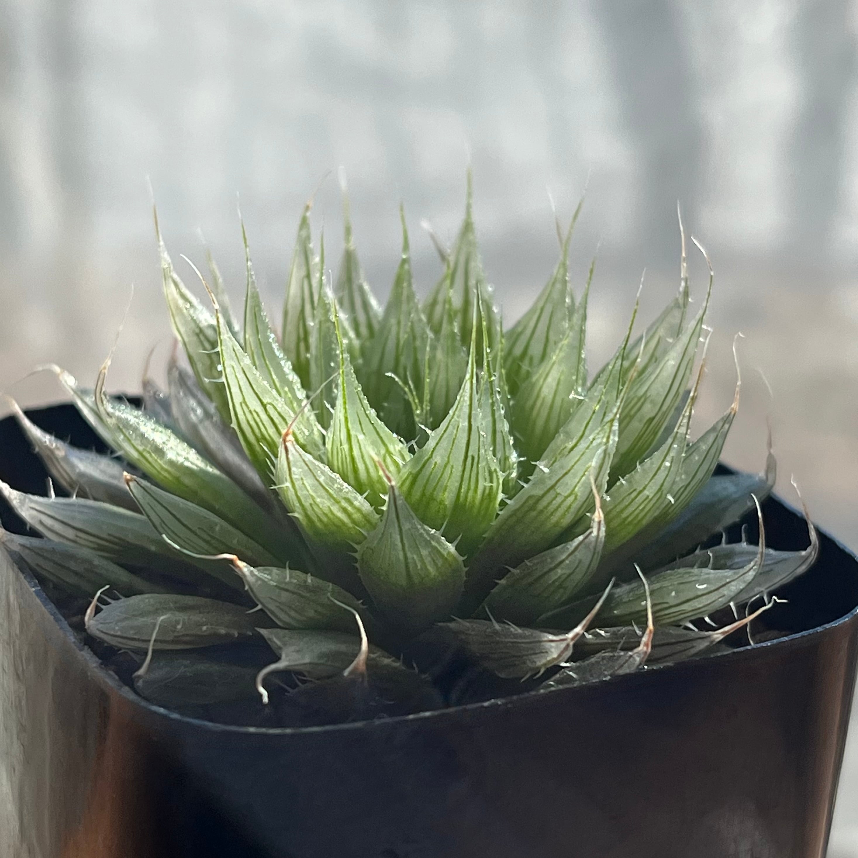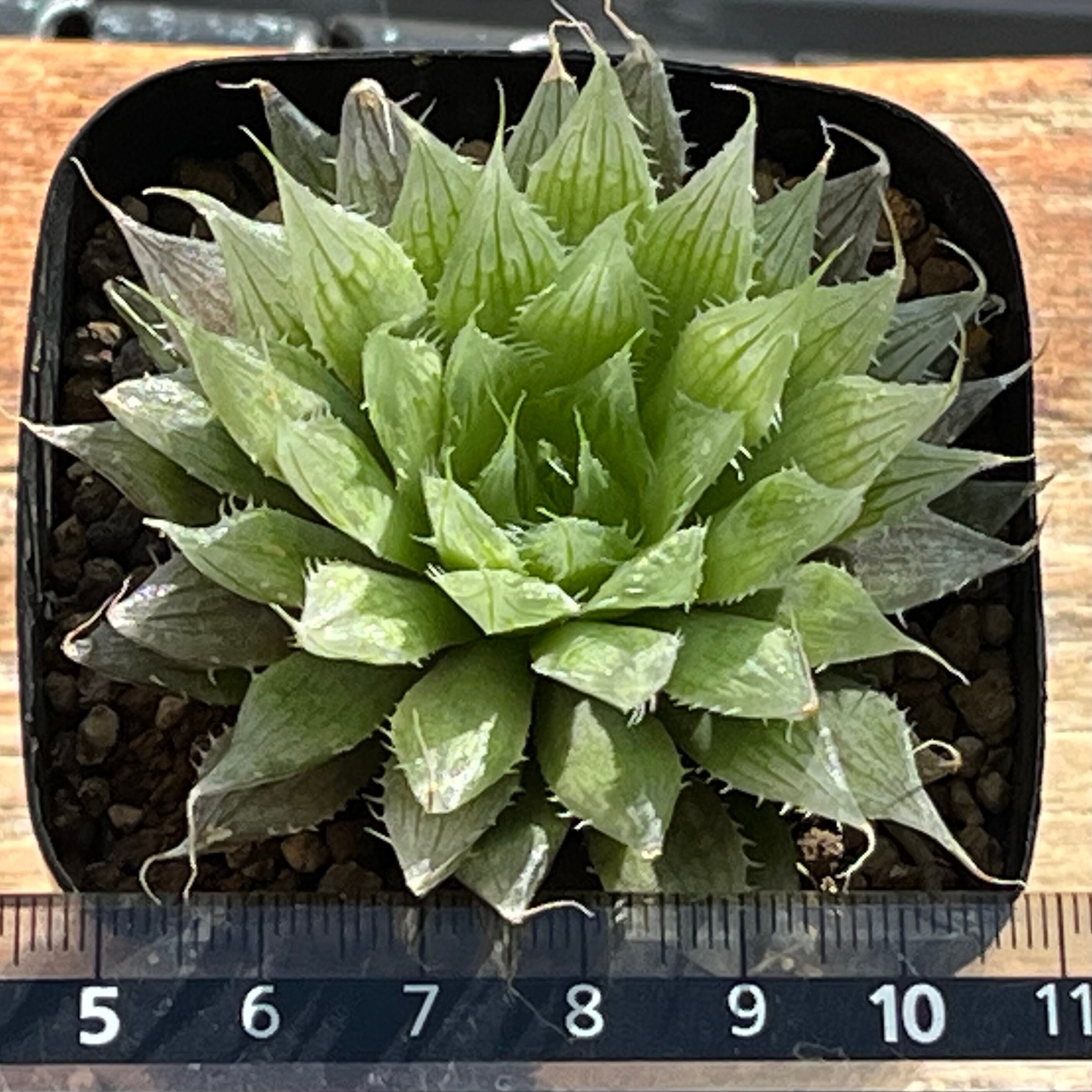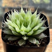 レース系で幅広薄葉にノギが特徴的です。透明度、色合いが美しいハオルチアになります。