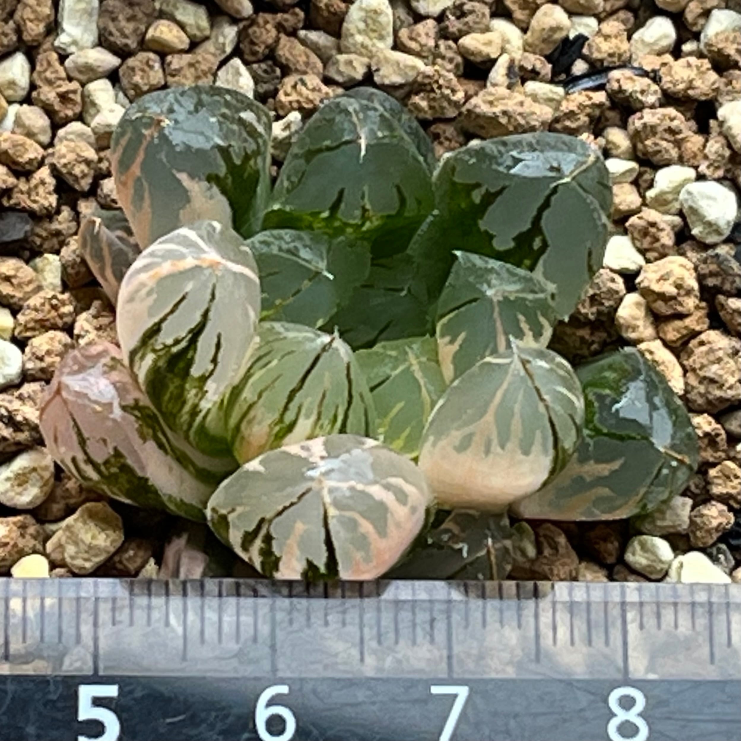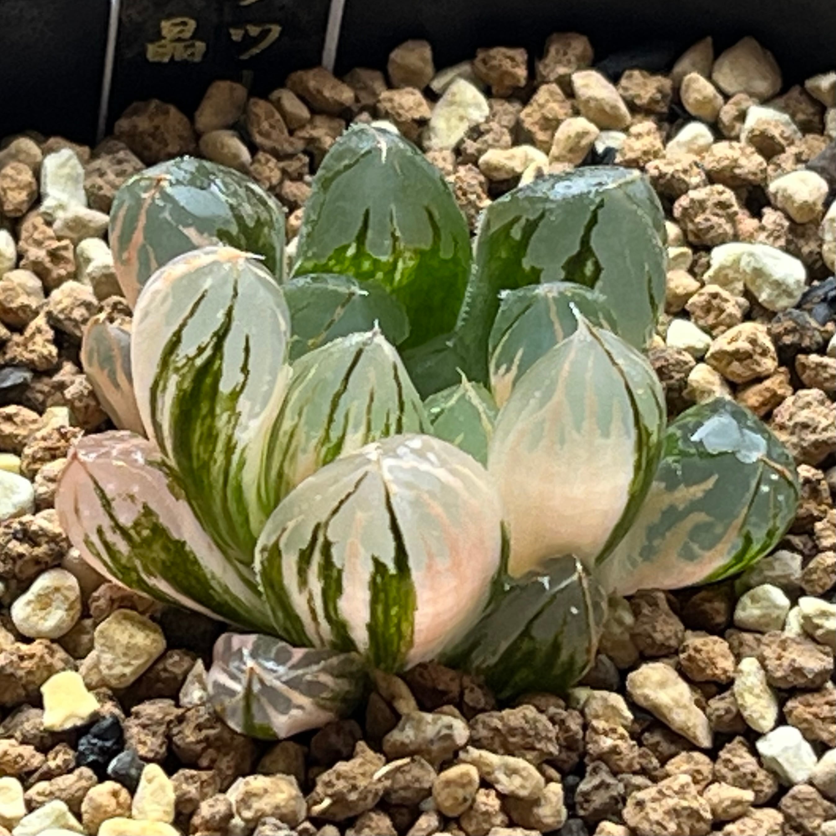 白光りした窓が綺麗なオブツーサ錦で、斑入りも良く有望株だと思います。